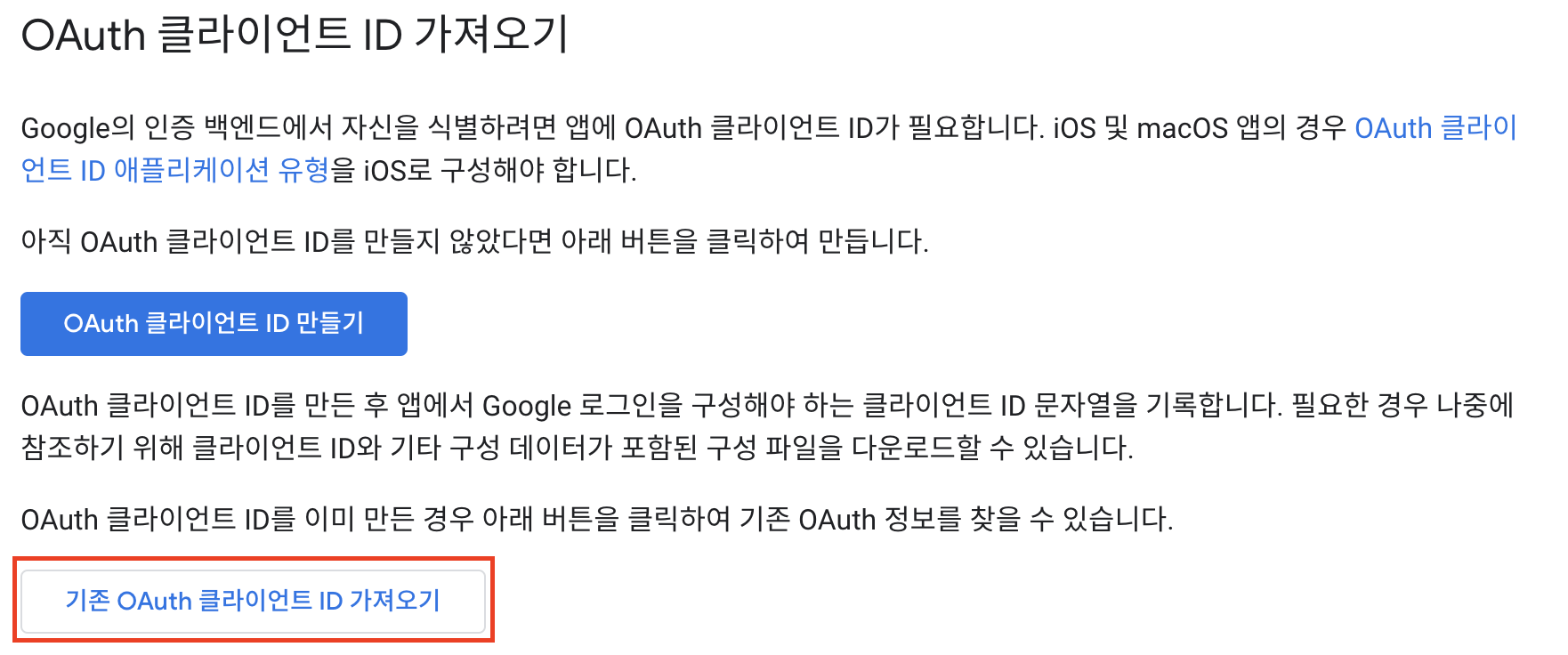 1. 이전 페이지에서 이번에는 하단의 "기존 OAuth 클라이언트 ID 가져오기" 버튼 클릭